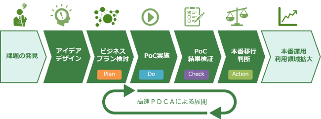 お客様が抱えている課題や目標、もしくは、お客様と一緒にそれが何かを考え、あくまでもツールである「IoT」により何が実現出来るかを検討し、 お客様と一緒に、まずは小さくかつ早く実証実験を繰り返し、実績を積み上げて、本番運用に移行できるようにご支援いたします。